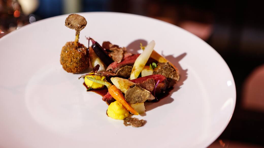 “Dedicato al piccioncino di nonna Emma” è un petto e coscetta fritta di piccione con crema di patate alla salsa olandese, verdure spadellate e tartufo preparata da Antonio