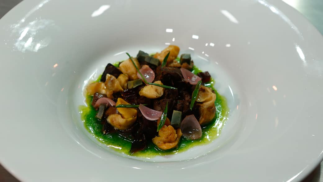 “Soffritto Boomerang”- soffritto di interiora alla birra con lumache di mare e uovo centenario su salsa di Parmigiano e prezzemolo. Grazie a questo piatto, Antonio vince l’Invention Test