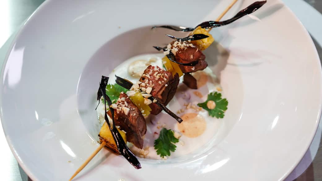 Dopodiché su uno spiedino alternare cubi di medie dimensioni di petto d'anatra e ananas scottato e appoggiarlo sul piatto senza che tocchi la salsa. Infine, aggiungere le mandorle croccanti e i filetti di melanzana fritta sullo spiedino.