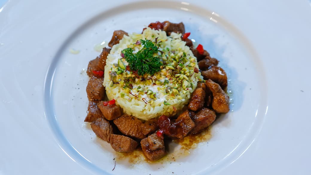 Nel frattempo, mettere sul fuoco una pentola con una quantità abbondante d’acqua salata e pistilli di zafferano, quindi versare il riso basmati. Una volta cotto, scolarlo e metterlo da parte. Infine, tritare e tostare in padella i pistacchi di Bronte.