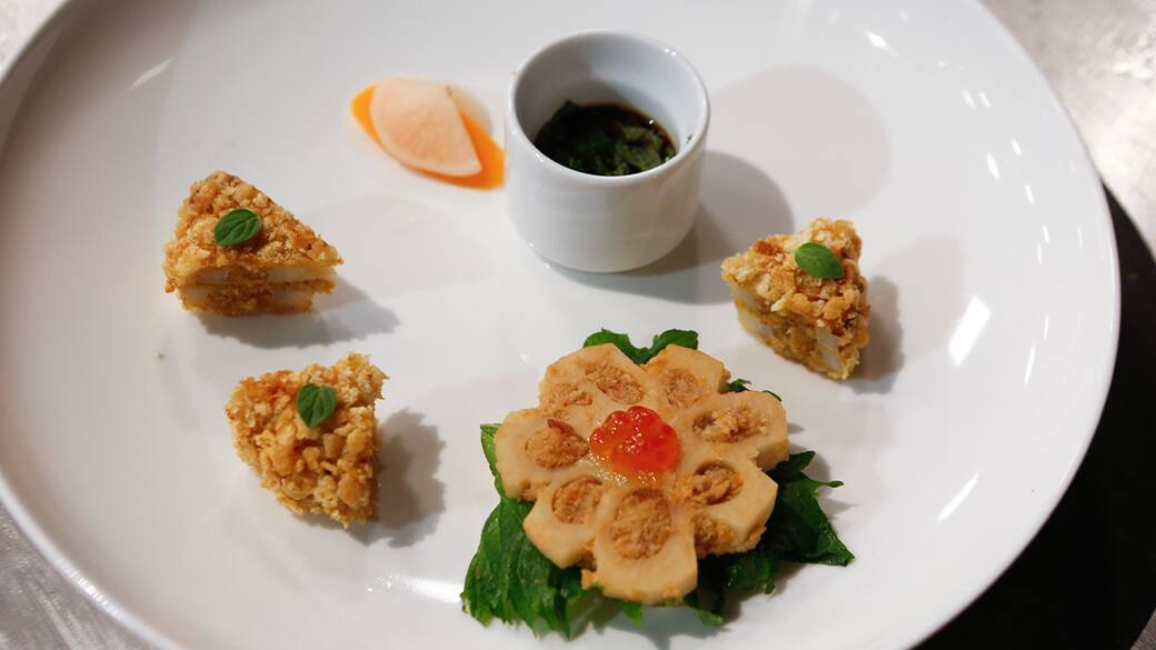 Al centro del piatto mettere la metà dell’impasto che non è stata fritta e intorno 3 spicchi di loto fritto con l’altra metà dell’impasto. Servire con la salsa worcestershire e guarnire con foglie di shiso e i sudachi.