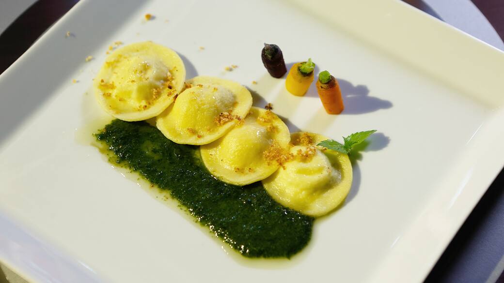 In un piatto quadrato, sistemare i 4 ravioli lucidati con l’olio in verticale nel mezzo, mettere il pesto al lato. Successivamente, spolverare il piatto con la granella di grissini e decorarlo con foglie di basilico santo.