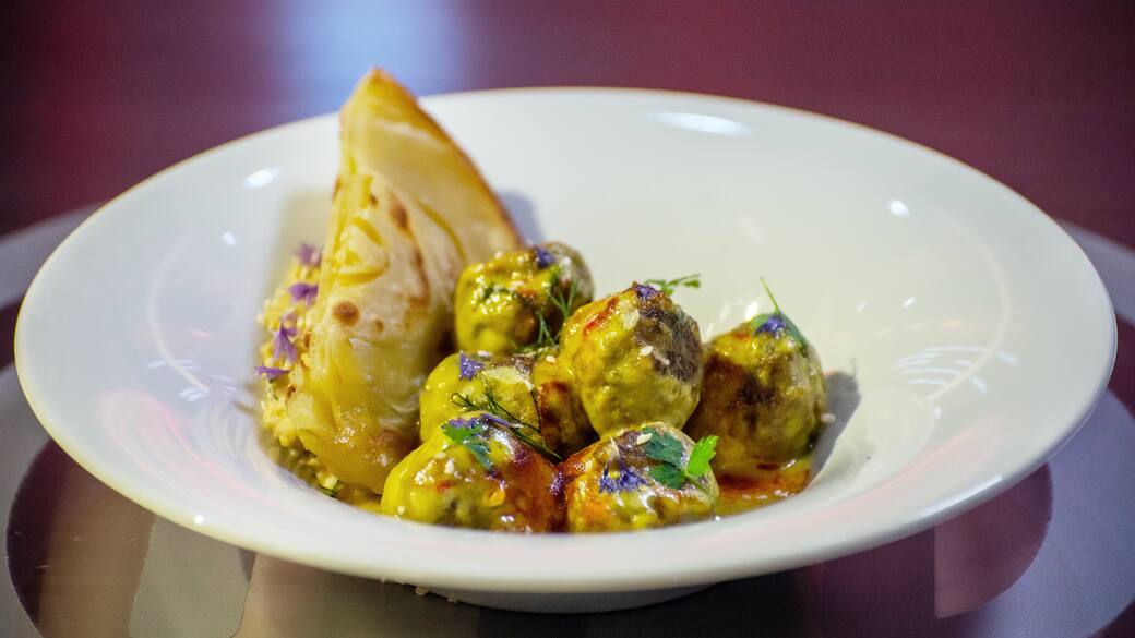 Disporre la crema di ceci su un piatto, un pezzo di pane e le polpette con la salsa rimasta nella padella. Decorare con del sesamo.