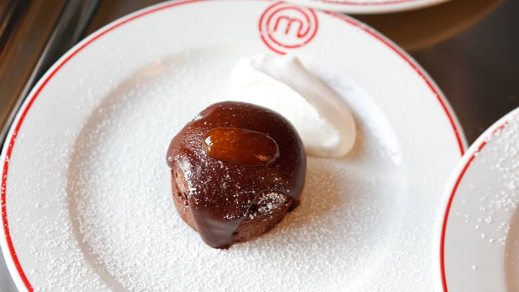 Tagliare a metà il tortino e inumidirlo con la bagna. Aggiungere un cucchiaino di marmellata di albicocche al centro e glassare con la ganache. Spolverizzare con zucchero a velo e aggiungere un cucchiaino di panna montata aromatizzata alla cannella.