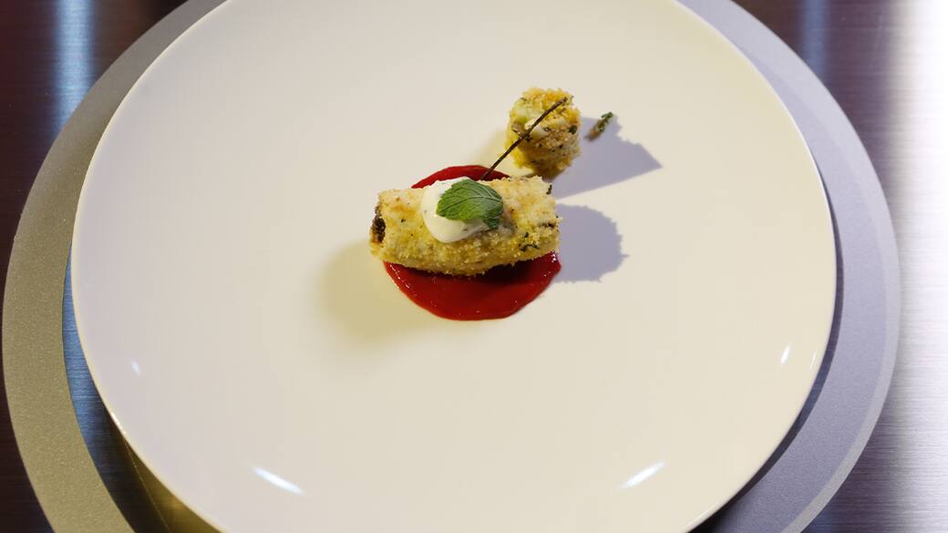 Con un coppapasta tondo disporre la salsa di lamponi, quindi adagiarvi sopra l’involtino, ponendogli sopra una sfera di fiocchi di latte e yogurt. Poi, con un coppapasta piccolo, creare un tortino con il mix di ripieno e chiudere il piatto in trasversale ponendoci una sezione di pelle croccante.