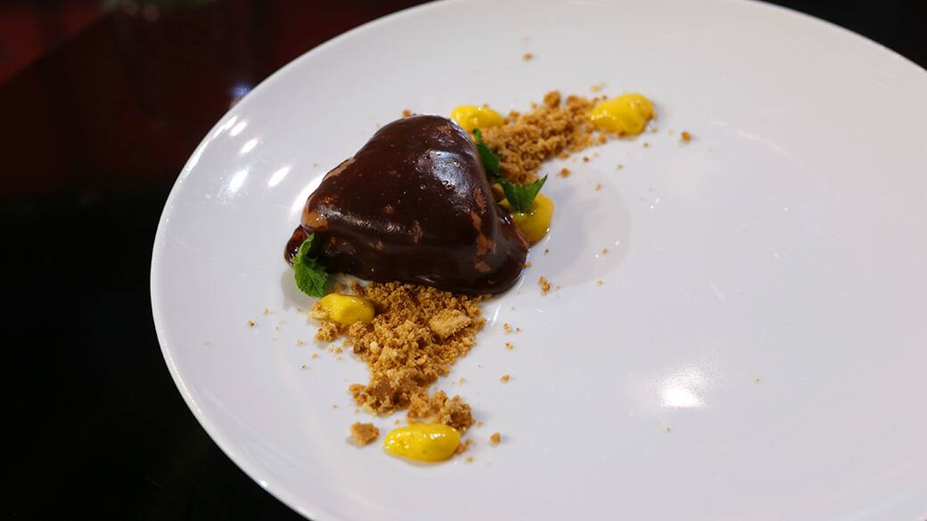 Sbucciare il mango e togliere il nocciolo, poi frullarlo con 20g di zucchero semolato, qualche foglia di menta e un goccio d'acqua. Setacciare la purea, prelevare 100g e portarla a bollore con il gellan. Riporlo in frigorifero per il tempo necessario per la gelificazione, poi rifrullarlo.