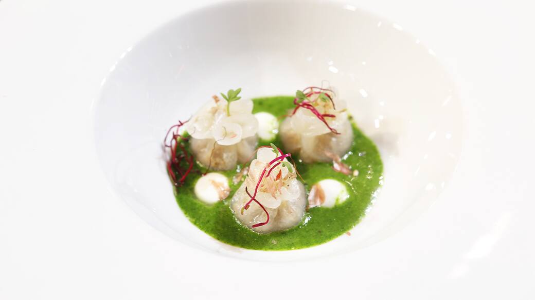 Mettere un cucchiaio e mezzo di crema alla base di un piatto con fondo stretto, sopra 3 fagottini e affianco a ciascuno le sfere. Poi, spargere i germogli e il pepe macinato per tutto il piatto.