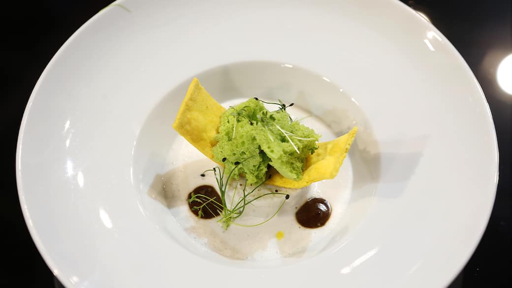 Poi mettere 2 uova, 1 tuorlo, la clorofilla, 50g di farina e un pizzico di sale nel bicchiere del minipimer e frullare per bene. Filtrare, per eliminare eventuali grumi e versare il tutto nel sifone da 500ml, caricarlo con due cartucce di protossido d'azoto e metterlo in frigorifero.