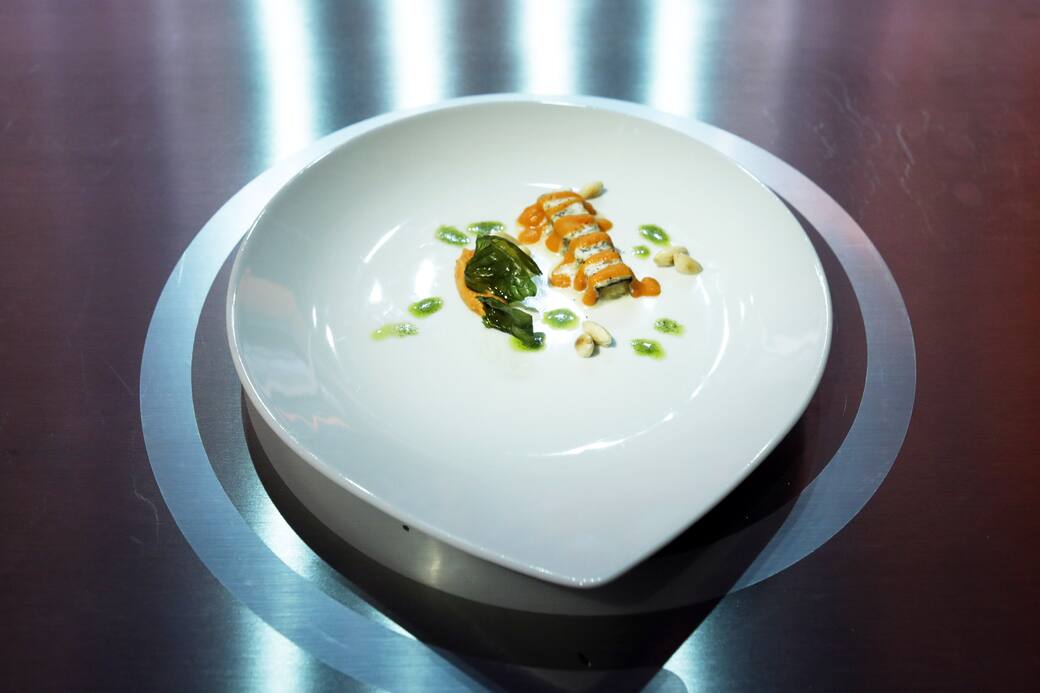 In un piatto piano posizioniamo la melanzana, vicino poggiamo anche una quenelle di pesto e sopra la quenelle posizioniamo le foglie di basilico fritte.