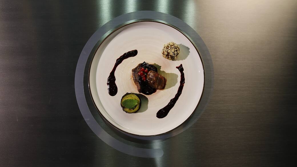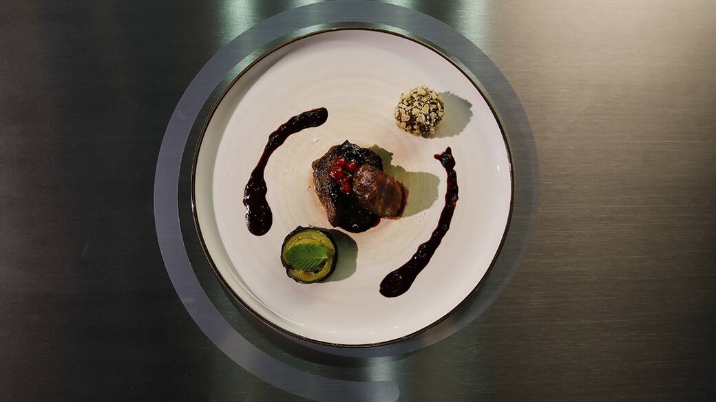 Comporre il piatto verticalmente tagliando a metà il controfiletto e sovrapponendo le due metà, aggiungere la salsa ai frutti rossi e cioccolato, la millefoglie di melanzana e una polpetta di cervo