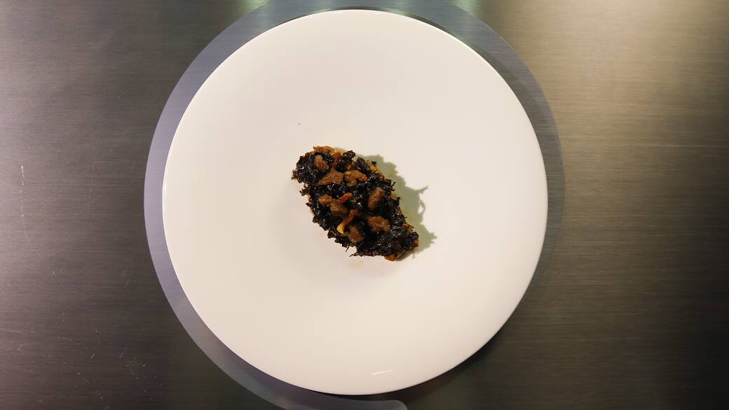Adagiare il petto di fagiano su un piatto fondo e guarnire il petto con l’insalatina di alghe. Aggiungere con la pipetta delle gocce di composta di mele e completare alla fine con acqua di lattuga.