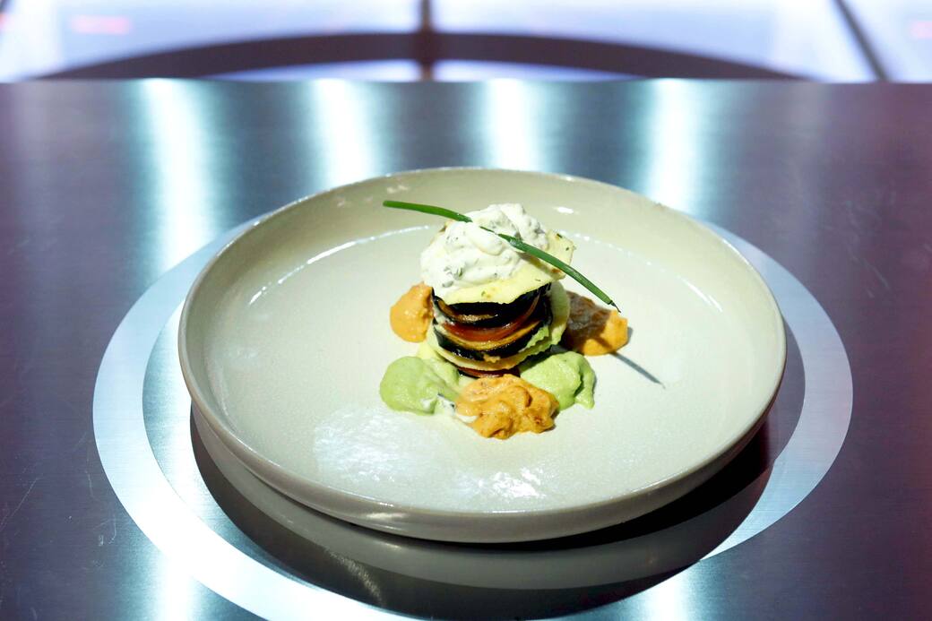 Riempire due sac a poche, una con il romesco al basilico e l'altra con il romesco ai pomodori secchi e creare delle piccole meringhette attorno al millefoglie.