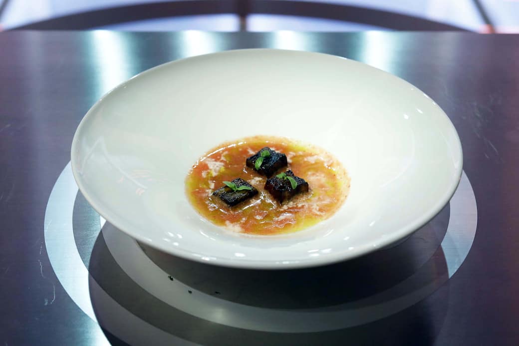 Rimuovere buccia e semi dal cetriolo, sbianchire i pomodori per rimuovere la buccia, pulire il peperone e mondare il porro, poi passare tutto al mixer insieme a qualche foglia di basilico e un pizzico di pepe e sale (stare attenti a bilanciare bene con la sapidità della salsa teriyaki). Filtrare con un colino a maglie strette metà composto e poi unirlo alla restante metà non filtrata.