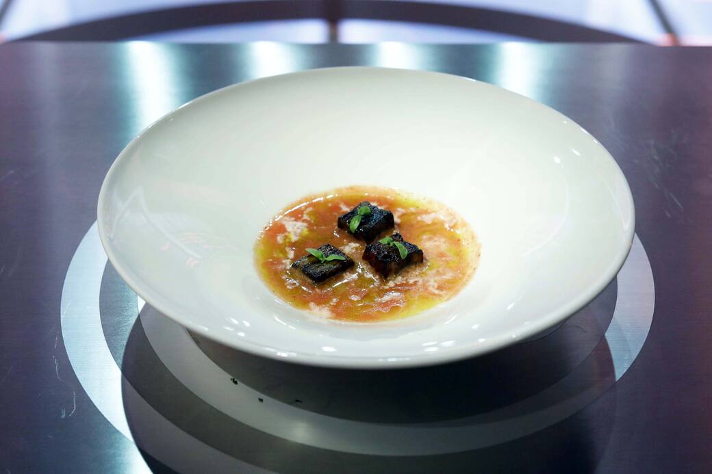 In un piatto fondo aggiungere il gazpacho e creare una spirale con la salsa alla scamorza.