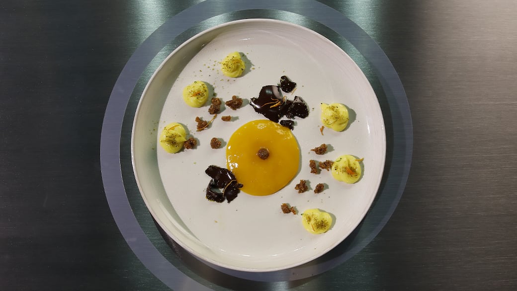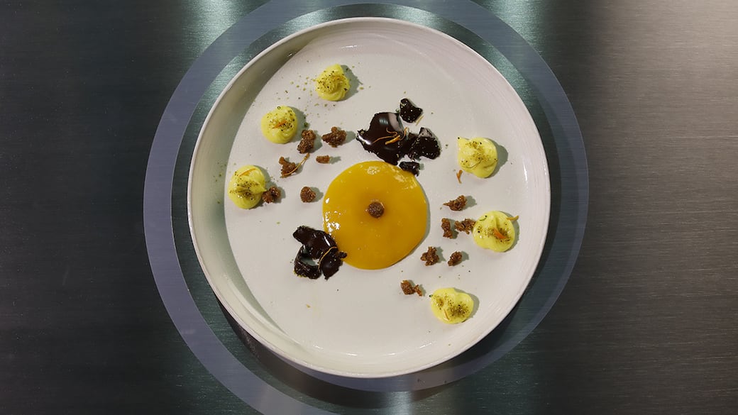 "Sfera di cioccolato con crema pasticcera e amaretti di Saronno" di Ollivier