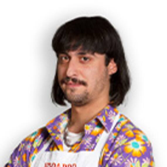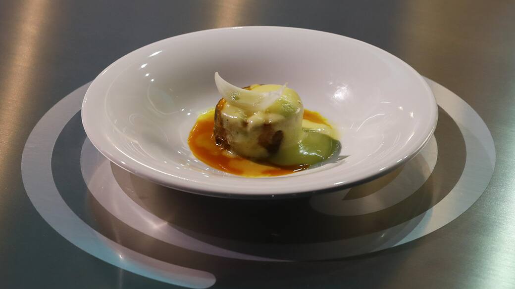 Impiattare al centro di una fondina la patata, versare le tre salse sopra la patata e infine appoggiare il petalo di cipolla sopra la patata.