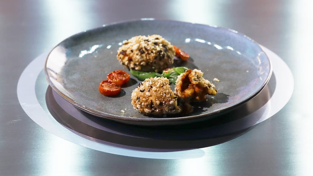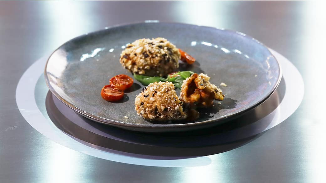 Pronta la teglia di parmigiana, ricavare dei dischi, lavorarli fino a ottenere la forma di un supplì e panarli in uovo, farina, pangrattato, poi ancora uovo e infine panko con la buccia di melanzana.