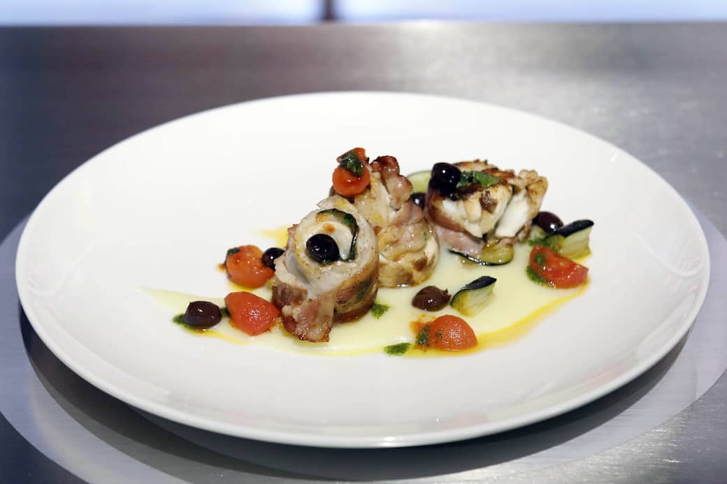 Su di un piatto, riporre alla base la crema di patate. Adagiare i rollè di branzino e, su di esso, aggiungere pancetta, melanzane fritte e pomodorini confit. Concludere il tutto con un filo di olio al basilico.