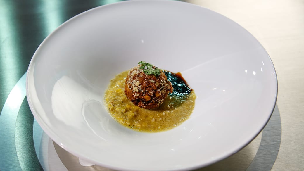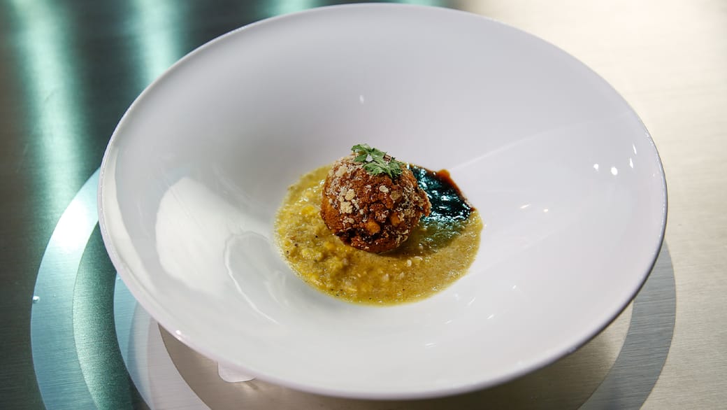 Prendere una fondina, versare 2 cucchiai di crema di mais e accanto uno di fondo Teryaki. Infine adagiare al centro la polpetta.