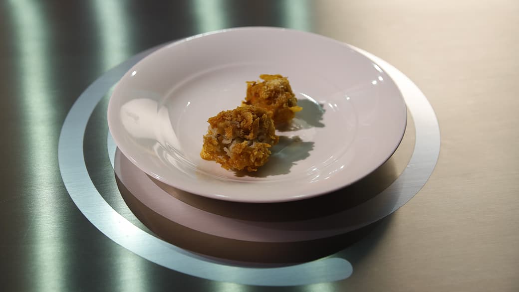 Formare delle palle di circa 5m utilizzando gli spaghetti saltati con collo e verdure. Mettere in abbattitore a negativo per almeno 20 minuti.