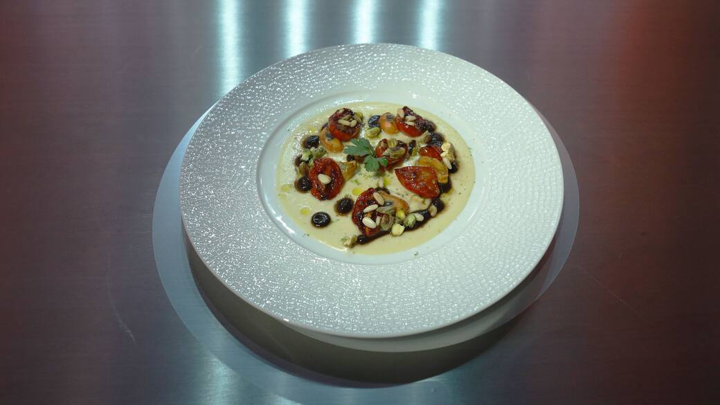 Adagiare le cozze, i pomodorini confit, i pinoli e i pistacchi tostati.