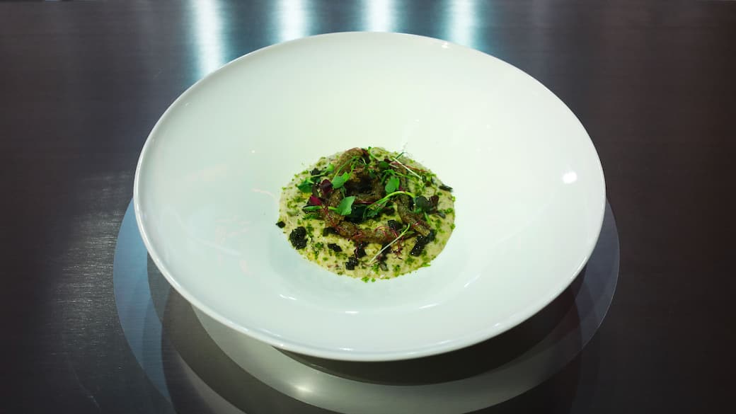 Riporre sulla base del piatto l'hummus di legumi. Adagiare l'alga tagliata a brunoise.