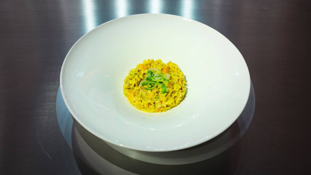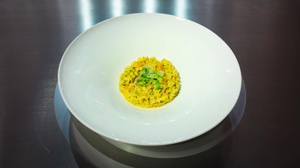Per il soffritto: tagliare a brunoise 1/4 di cipolla rimasta, 20gr di carota e 20gf di sedano.