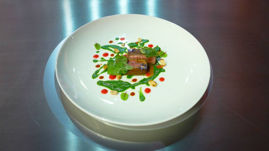 Su di un piatto piano, distribuire, in modo casuale, la salsa verde. Riporre al centro i due rettangolini di manzo.