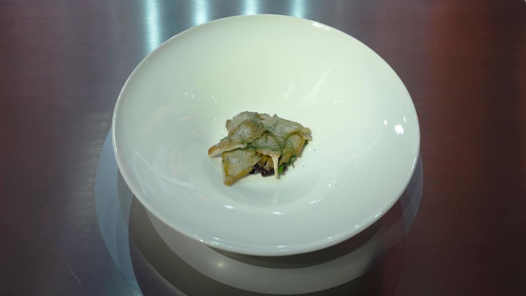 Su di una fondina, inserire un coppapasta. Sul fondo, aggiungere le alghe e le foglie d'ostrica.