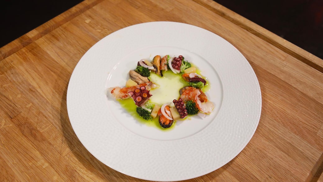Prendere un piatto rotondo e largo, incominciare ad assemblare il piatto aggiungendo i vari elementi in modo circolare partendo dal polpo, poi patate, broccolo, cozze e gamberi. Una volta chiuso il cerchio, versare all’interno l'intingolo al prezzemolo.