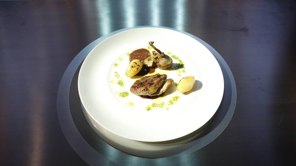 Posizionare la coscetta di pernice nel piatto, con l’osso rivolto verso l’altro. Adagiare accanto il petto di pernice e la riduzione al centro. Posizionare con delle pinze da cucina i funghi e le patate fino ad ottenere la composizione desiderata.