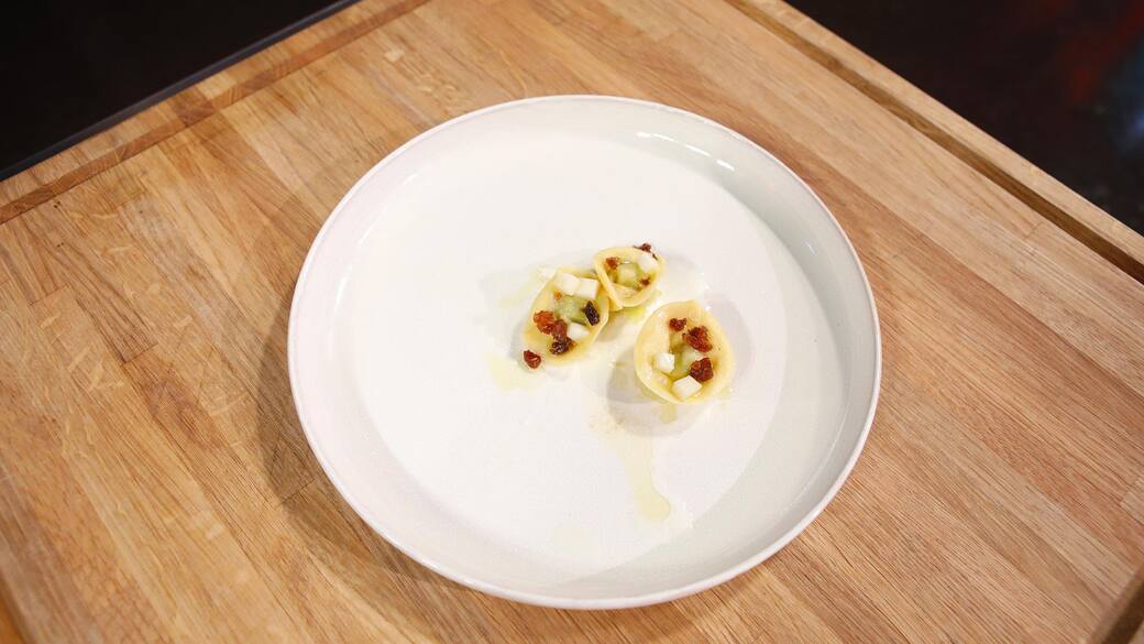 Cuocere i tortelli nell'acqua in cui è stato sbollentato il broccolo e, nel frattempo, passare alla preparazione delle guarnizioni. Tagliare il gambo di broccolo croccante, ricavandone una brunoise. Poi tritare l'uvetta.