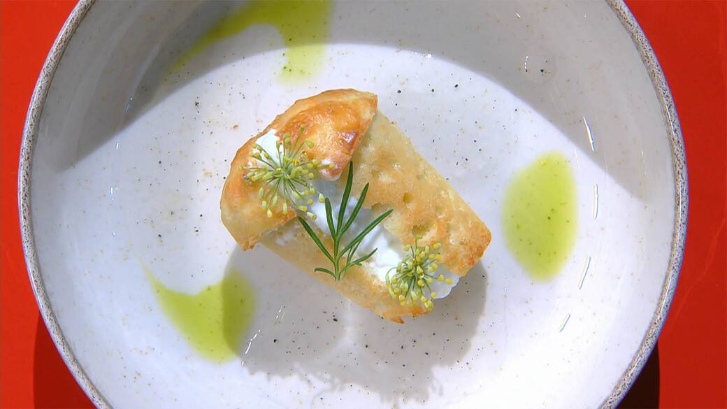 Scopri la ricetta di ‘Uguale Babà, no?’, il dessert del menù di Anna servito durante la finale: un babà al rum e osmanto con mousse di mozzarella e cocco, arricchito da un olio al tagetes.