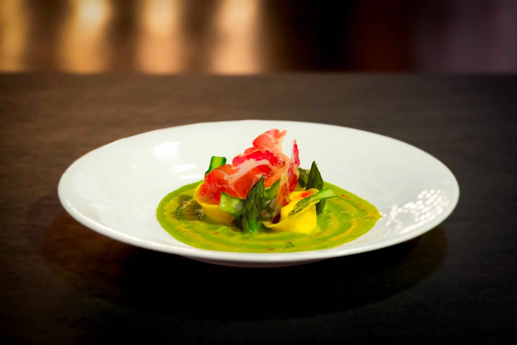 Impiattamento Sul fondo del piatto, stendere la salsa di asparagi e creare sopra una spirale con la crema di tuorlo allo zafferano. Adagiare i cappellacci in modo armonico e completare con le punte di asparago, le lamelle crude e le chips di coppa croccante. Un tocco di pepe multicolore e un filo d’olio evo chiudono il piatto con eleganza.