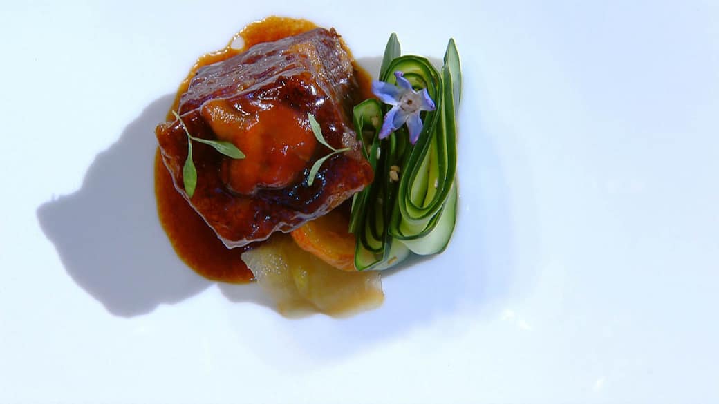 Scopri la ricetta de ‘Il Potere del Tempo’, il secondo piatto del menù di Anna servito durante la finale: una pancia di maiale laccata con spezie orientali, accompagnata da un'insalata di cetrioli, susine e peperoncino, con l'aggiunta di ricci di mare.