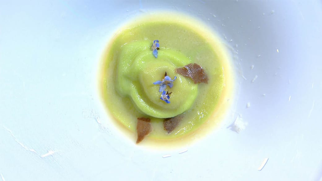 Scopri la ricetta de 'L'Alba Nel Piatto', il primo piatto del menù di Simone servito durante la finale: raviolo bicolore con tuorlo morbido, servito su una fonduta al tartufo e burro montato al tartufo bianco.