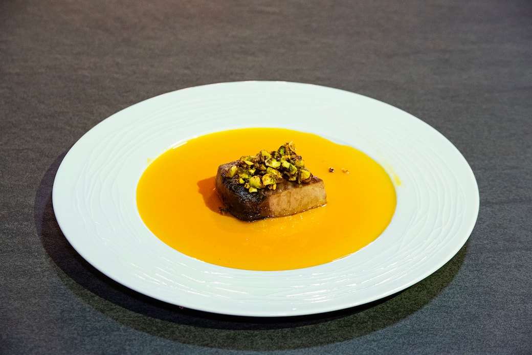 Impiattamento Tagliare il tonno in tranci regolari e disporli al centro del piatto. Adagiare sopra un frammento di croccante di pistacchi e completare con la salsa di limone e zafferano versata intorno. Un filo d’olio a crudo e, se vuoi, una scorza di limone per profumare il piatto.
