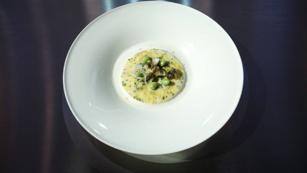 Impiattamento: Capovolgere il budino di uovo al centro di un piatto fondo. Guarnire la superficie con garusoli ed edamame. Versare intorno il latte freddo al salak e aggiungere qualche goccia di glassa di melograno. Completare con un pizzico di sale e un filo d’olio.