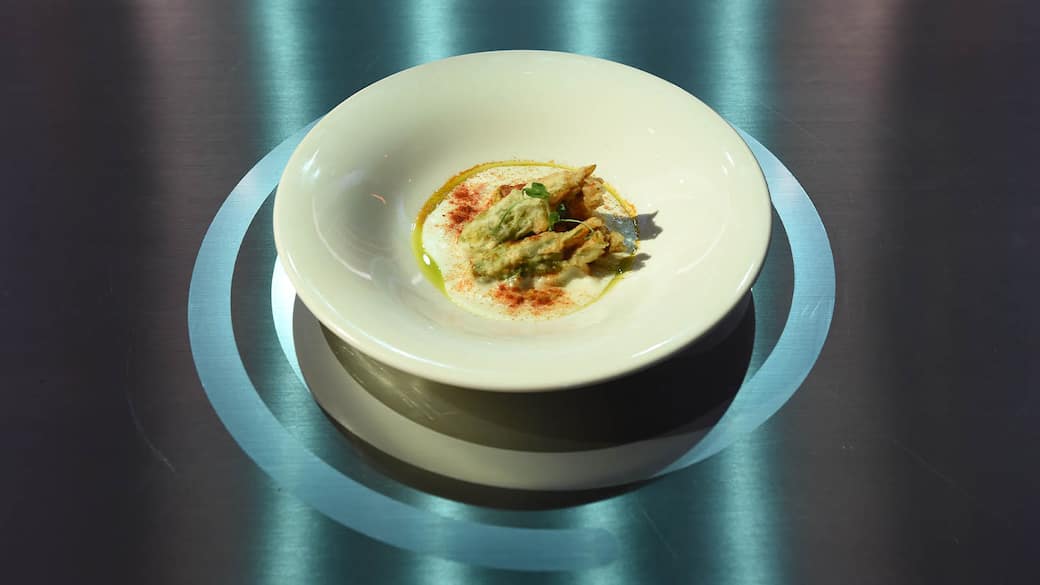 Riempire i fiori di zucca con la farcia. Preparare la pastella mescolando la farina con l’acqua frizzante. Immergere i fiori di zucca nella pastella e friggerli in olio caldo a 200°C per 40 secondi. Scolare su carta assorbente e salare con il sale Maldon.