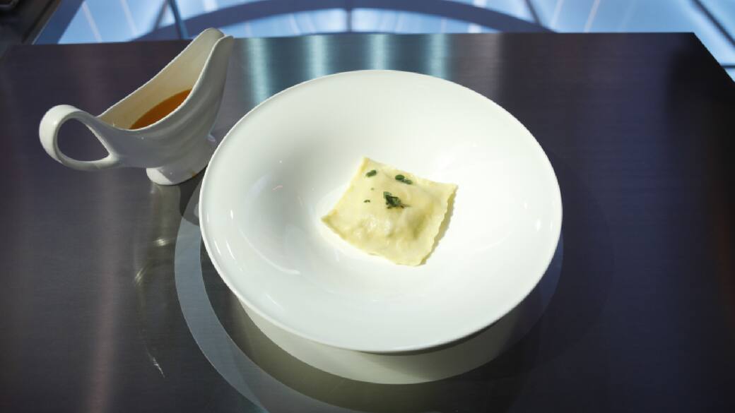 Servire i ravioli con il fumetto di pesce filtrato versato delicatamente sopra.