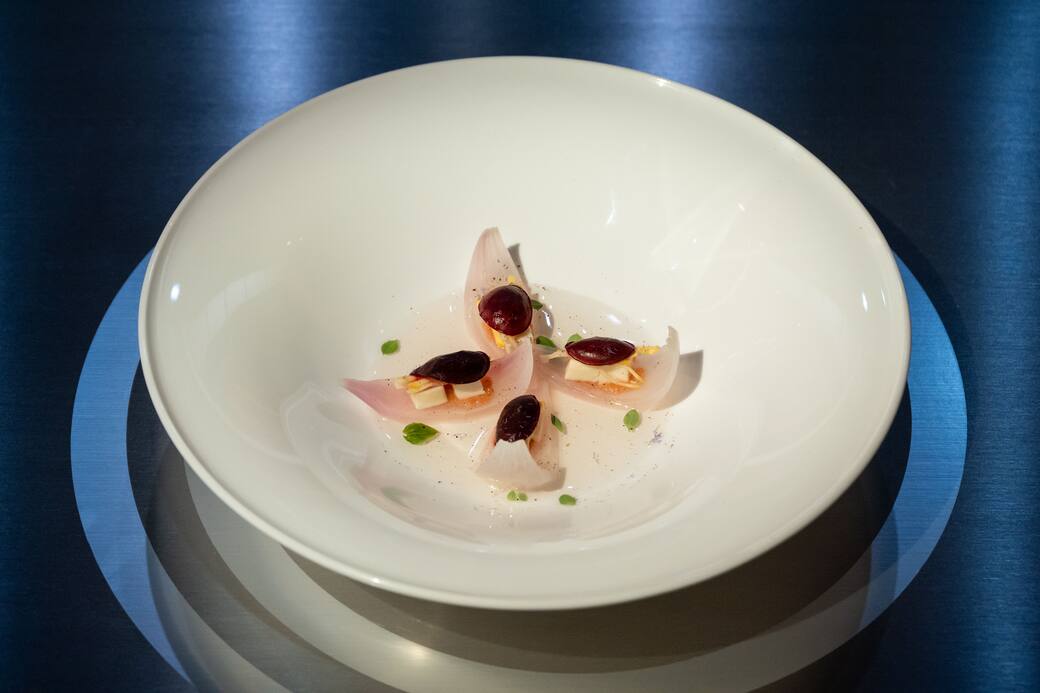 Versa sul fondo del piatto l’acqua di pomodoro filtrata. Disponi i petali di cipolla in modo ordinato, con la parte concava verso l’alto. Al centro di ogni petalo sistema un pezzetto di formaggio Gingertana. Copri ciascun pezzetto con una metà di prugna caramellata, creando una piccola cupola naturale. Termina con una spolverata uniforme di polvere di buccia di cipolla per aggiungere intensità e un tocco aromatico.
