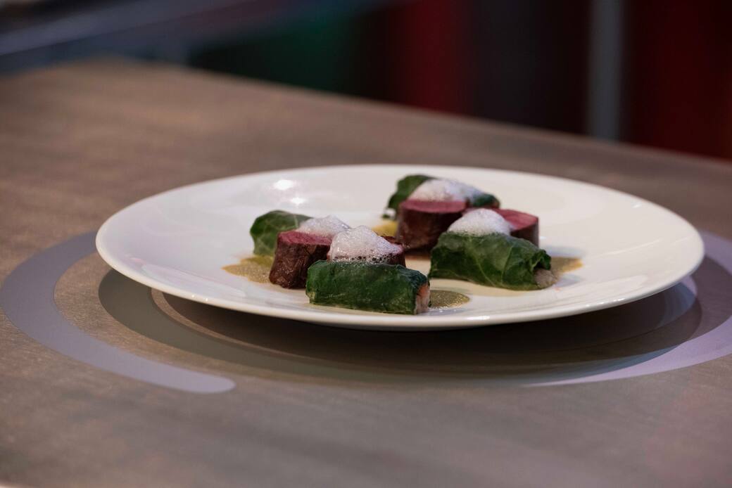 Adagiare la crema di baccelli sul fondo del piatto, disporre sopra gli involtini di cinghiale e accanto qualche fetta del filetto naturale. Completare con un velo d’aria ai carciofi, che aggiunge profumo e leggerezza.