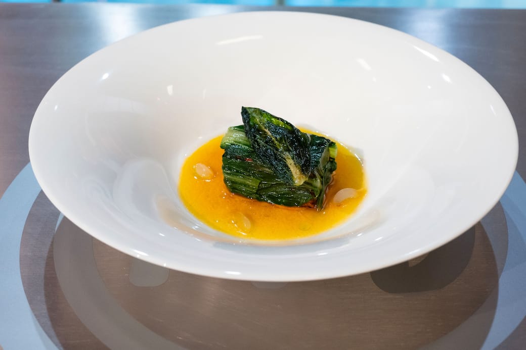 Scopri Azzardo, un involtino di tofu con chips croccante di pak choi, con brodo allo zafferano, piatto con cui Carlotta ha vinto la Mystery Box con opsite Anna Zhang della decima puntata di MasterChef 15.