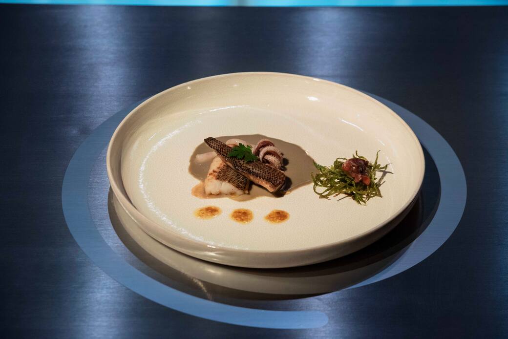 Sul piatto piano, versare al centro un cerchio di salsa calda. Adagiare sopra i filetti di boccalone con la pelle verso l’alto e accanto i tentacoli di seppia. A un lato del piatto, disporre un piccolo nido di chiffonade di piselli fritta e adagiarvi sopra la bivalva condita. Completare con piccoli punti di crema di uova di pesce accanto alla salsa, creando un contrasto visivo e gustativo. Servire subito, con la salsa ben calda.