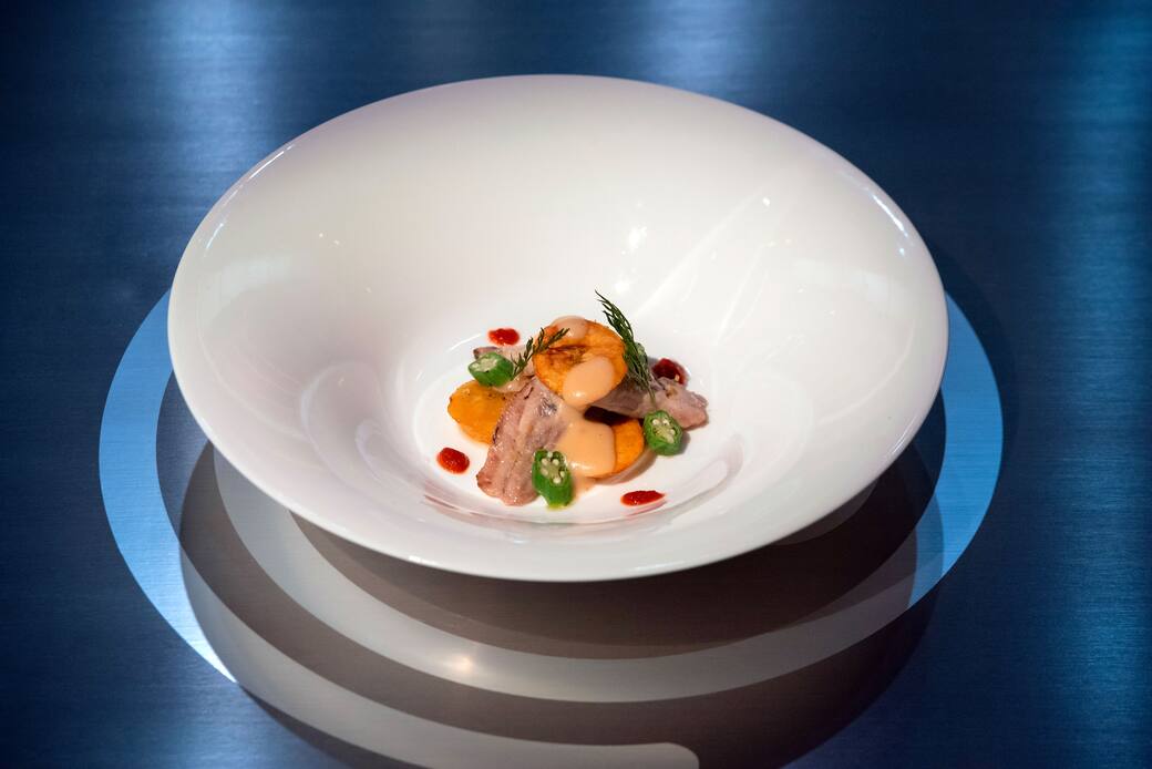 Impiattamento Sul fondo del piatto stendere una cucchiaiata di crema di platano. Adagiare sopra una o due sarde ancora tiepide. Completare con alcune chips di platano fritto, l’ocra condita e una spolverata di aneto fresco tritato. Finitura con scorza di limone grattugiata e un pizzico di sale Maldon per esaltare la freschezza del piatto.