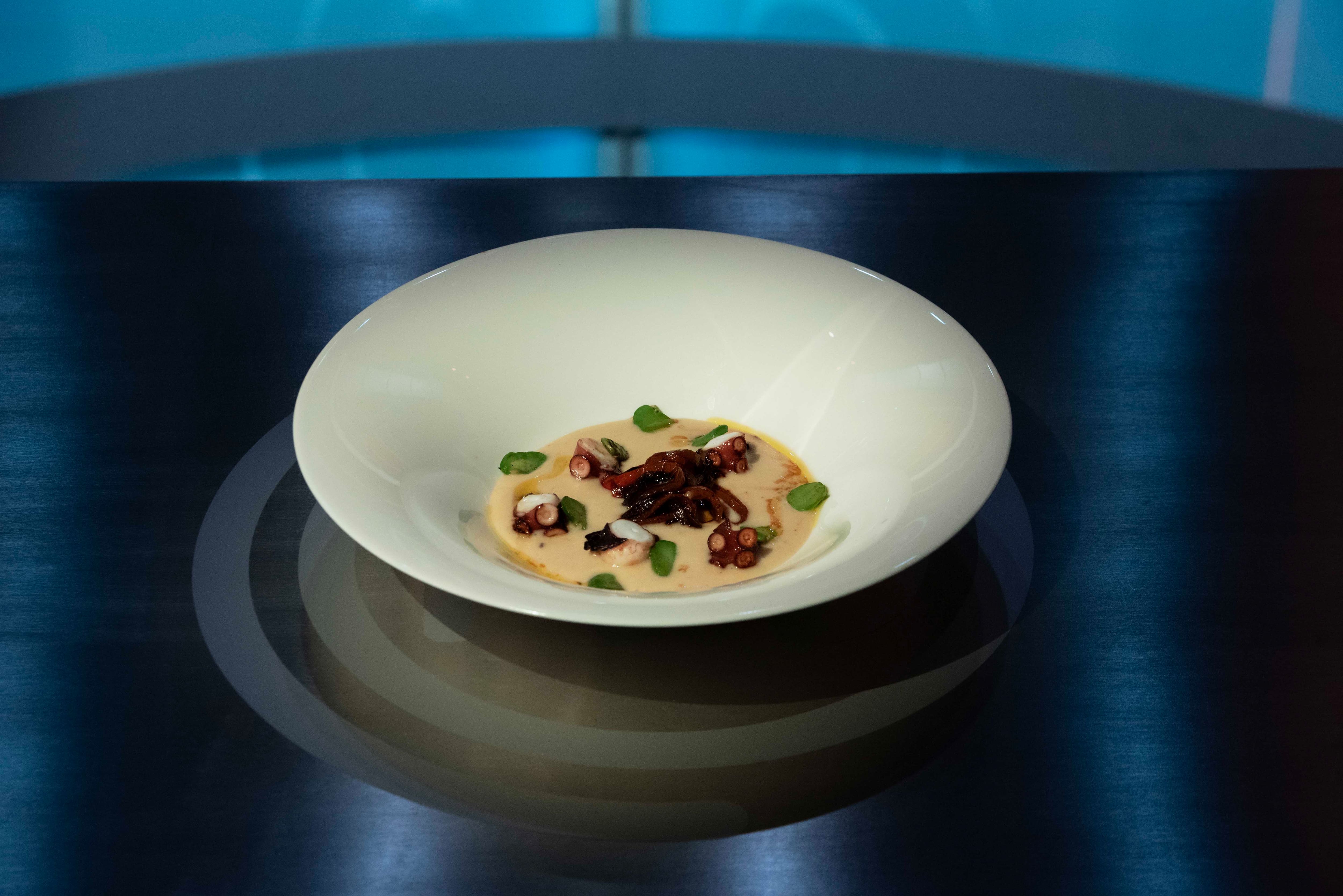 Polpo scottato su crema di patate con olio alla menta di Dounia