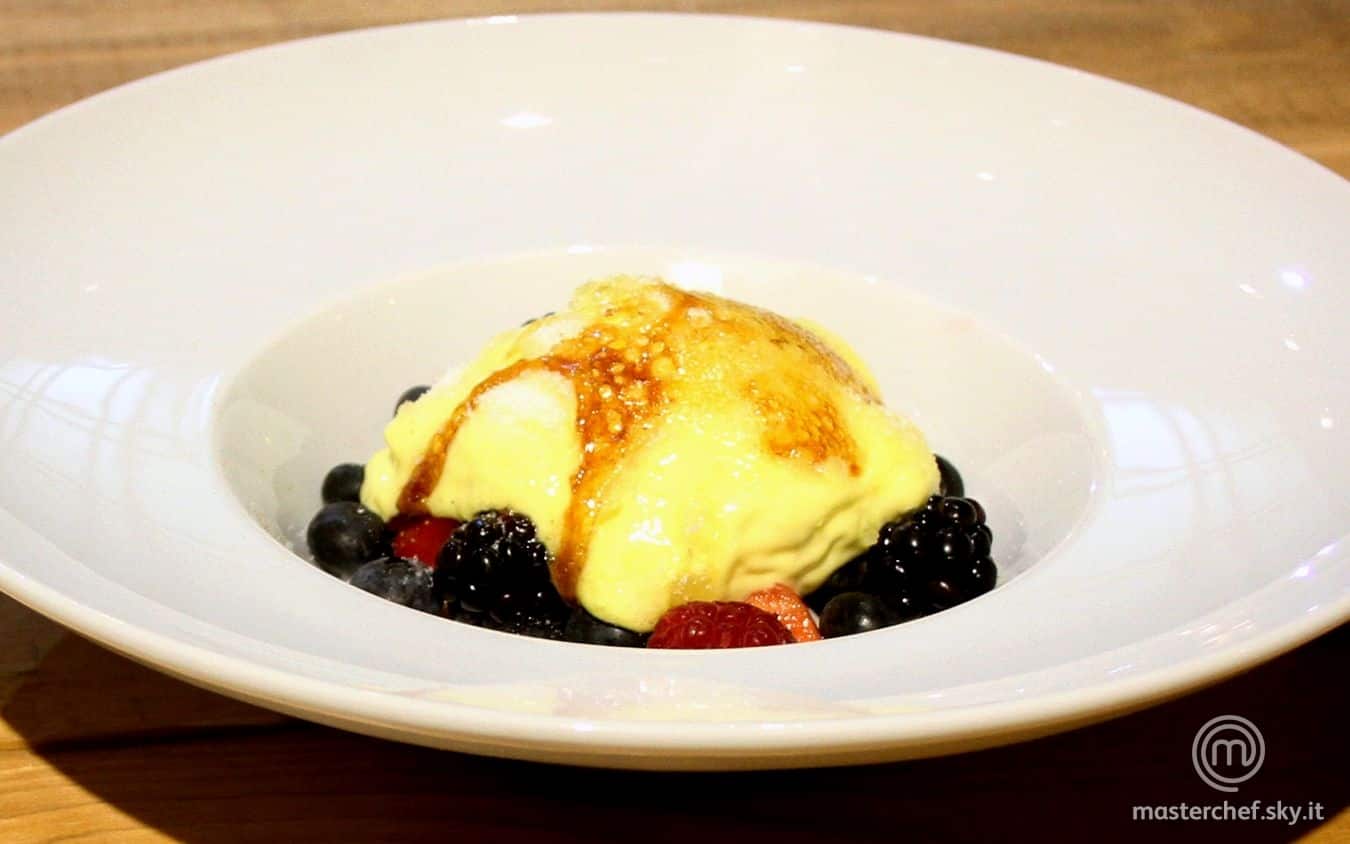 Spuma di crema catalana ai frutti di bosco